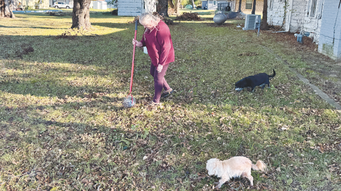 As a cold front finally brings some fall-feeling brisk weather to the county, René Morris — with the help of Walter and Weezie, her two dogs — braves the cold north wind to harvest pecans on Wednesday morning, October 29.