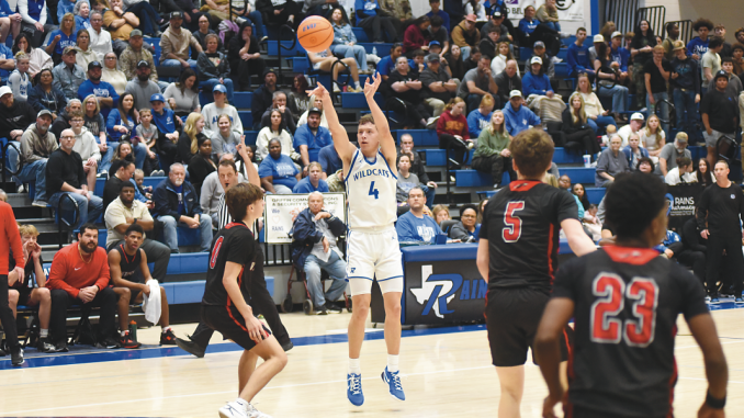 In front of a packed gym, senior Wildcat Gunner Cook puts up a three-point shot allowing the Wildcats to retake the lead in the 38-31 district victory over the Winnsboro Raiders on Friday night, January 30, in Talkington Gym.